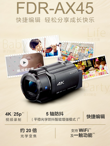 索尼(SONY)FDR-AX45A 家用/直播4K高清數(shù)碼攝像機 /DV/攝影機/錄像機(含128G卡+三腳架+包+UV鏡+備用電池+充電器)